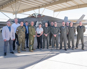 Members of the Royal Canadian Air Force pose for a group photo in front of an F-35A Lightning II assigned to Luke Air Force Base, during a base visit, Oct. 28, 2025, at Luke AFB, Arizona. The visit highlighted the long-standing partnership between the U.S. and Canada, particularly in the realm of