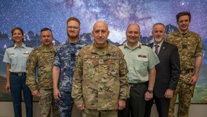U.S. Space Force Brig. Gen. Brian Sidari, U.S. Space Command intelligence director, poses for a photo with foreign intelligence Allies from Canada, Australia and the United Kingdom during the Second Annual Senior Space Intelligence Seminar, Colorado Springs, Colo., April 13, 2023.