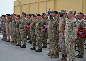 Senior Military officers from nine nations salute during Remembrance Day at an undisclosed location in the U.S Central Command area of responsibility, at an undisclosed location within the U.S. Central Command area of responsibility, Nov. 11, 2023. U.S. Air Force personnel gathered with their joint