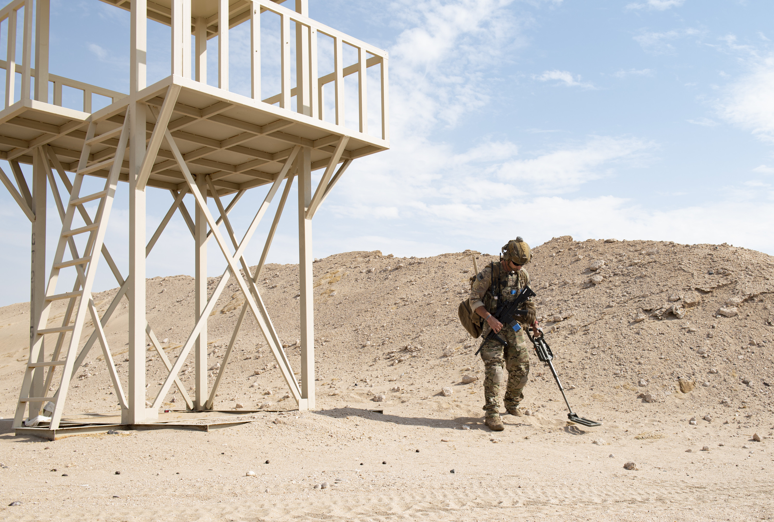 A U.S. Air Force explosive ordnance disposal technician sweeps a metal detector for hidden explosives during a field training exercise at Forward Operating Base Gerber, Kuwait, Nov. 15, 2021. The 386th Expeditionary Civil Engineer Squadron Explosive Ordnance Flight hosted the FTX which included members from the U.S. Army, U.S. Navy, U.S. Marine Corps, Royal Air force and Royal Australian Air Force. The multinational forces training included ordnance clearing, identifying homemade explosives, defeating unmanned aerial vehicles, improvised explosive devices and suicide vests. (U.S. Air Force photo by Senior Airman Michael S. Murphy)