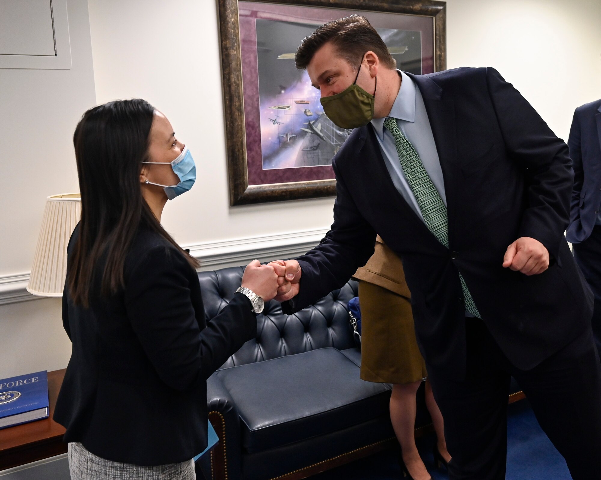 Under Secretary of the Air Force Gina Ortiz Jones, center left, speaks with Minister James Heappey, parliamentary under secretary of state for the armed forces of the United Kingdom, during a meeting at the Pentagon, Arlington, Va., Feb. 2, 2022. (U.S. Air Force photo by Eric Dietrich)