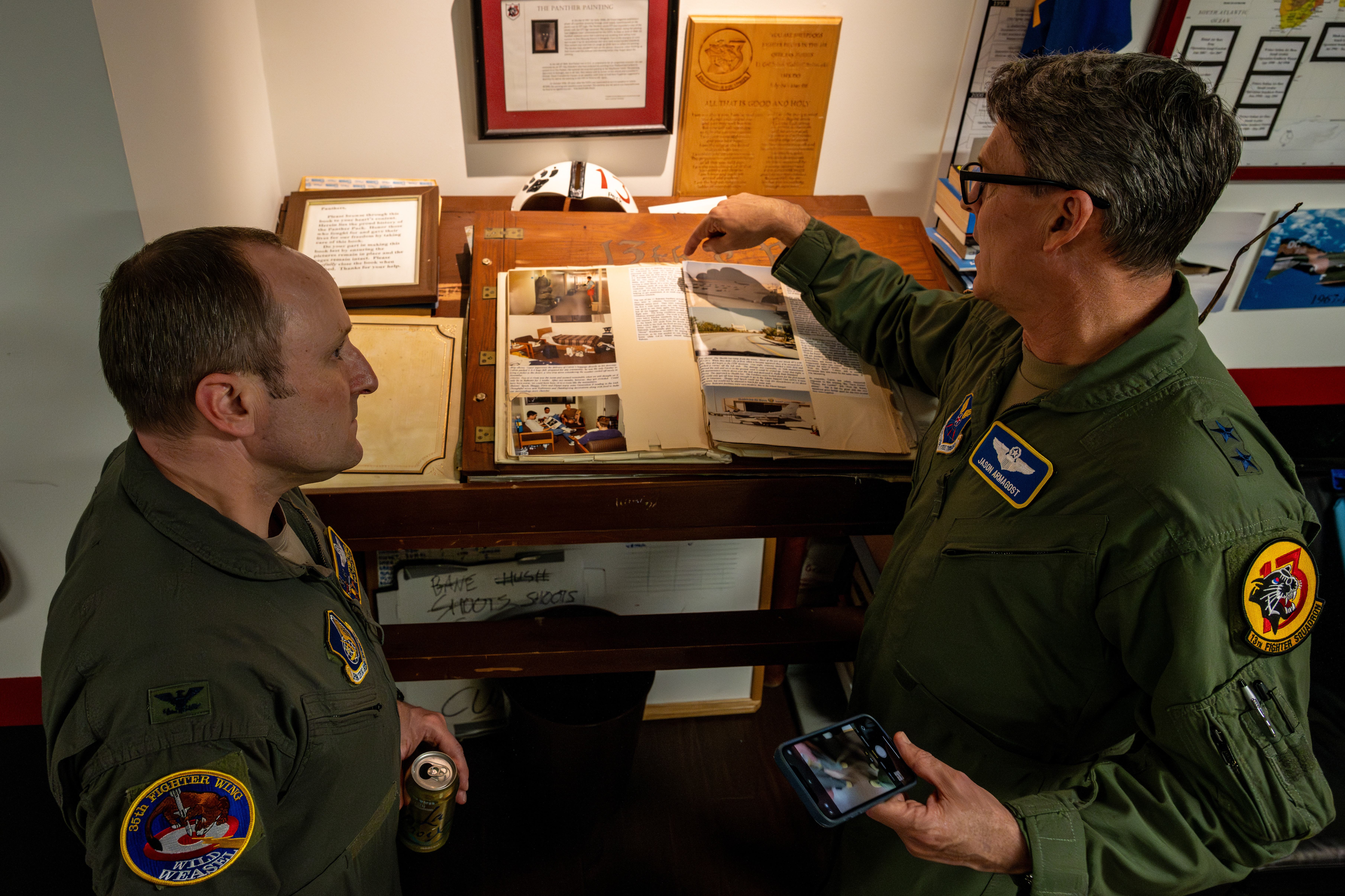 Japan Air Self-Defense Force Lt. Gen. Seiki Kageura, center, deputy commander of the Air Defense Command speaks with U.S. Air Force Chief Master Sgt. Ronnie Woods, left, Eighth Air Force Command Chief and U.S. Air Force Maj. Gen. Jason Armagost, commander Eighth Air Force and Joint-Global Strike Operations Center, at Yokota Air Base, Japan, April 30, 2025. The engagement strengthens alliances and partnerships toward a free and open Indo-Pacific. (U.S. Air Force courtesy photo)